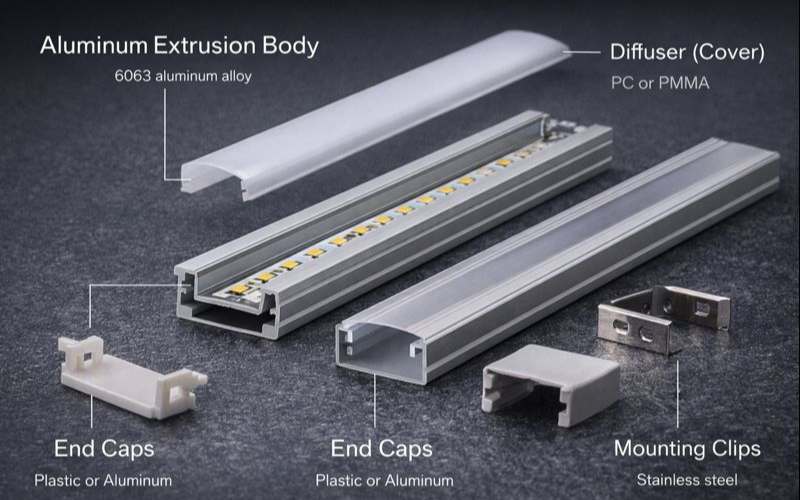 LED aluminum profiles (also called LED aluminum channels or extrusions) are aluminum housings designed to hold LED strips, diffusers, and accessories. Their main functions are: